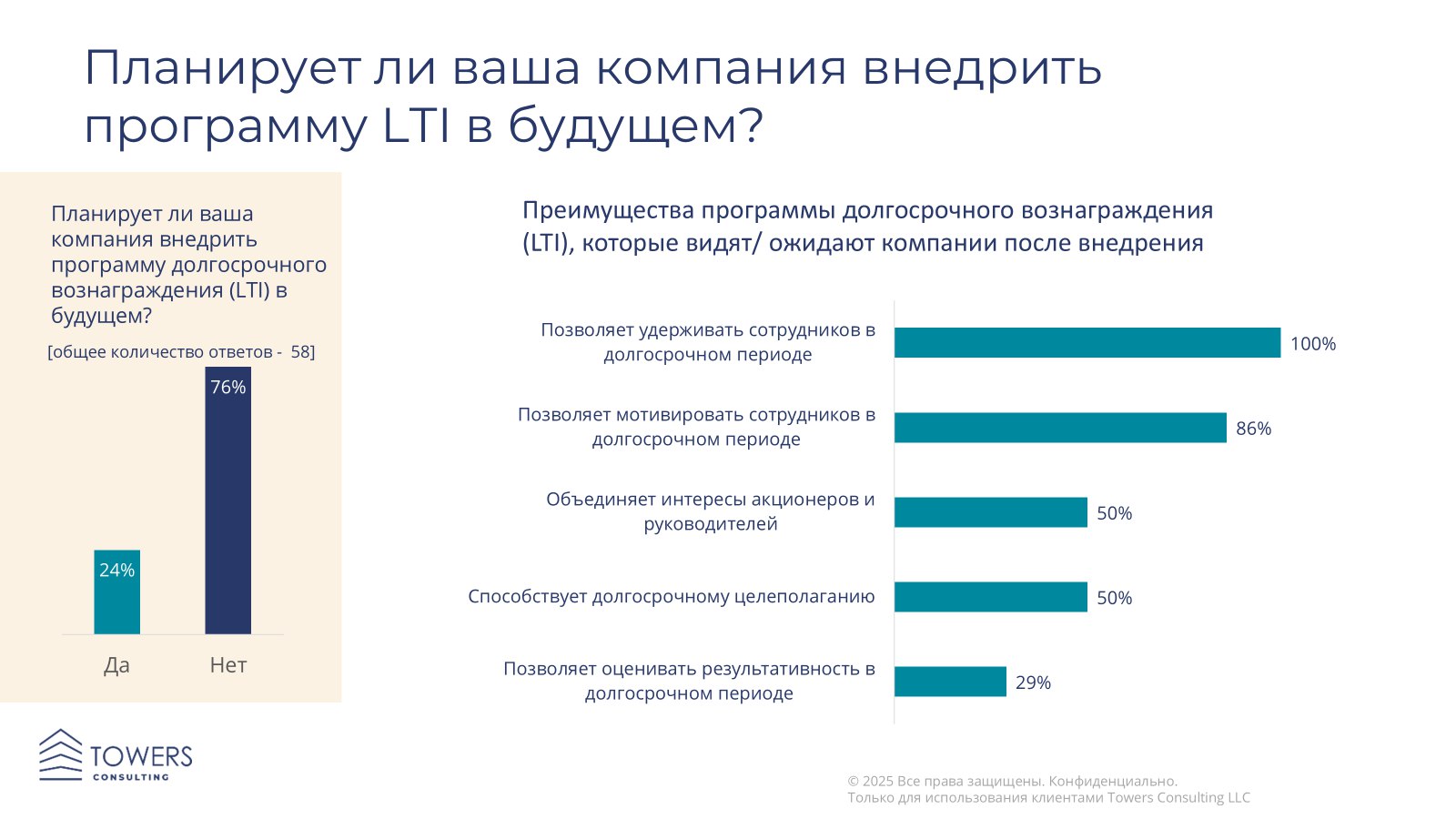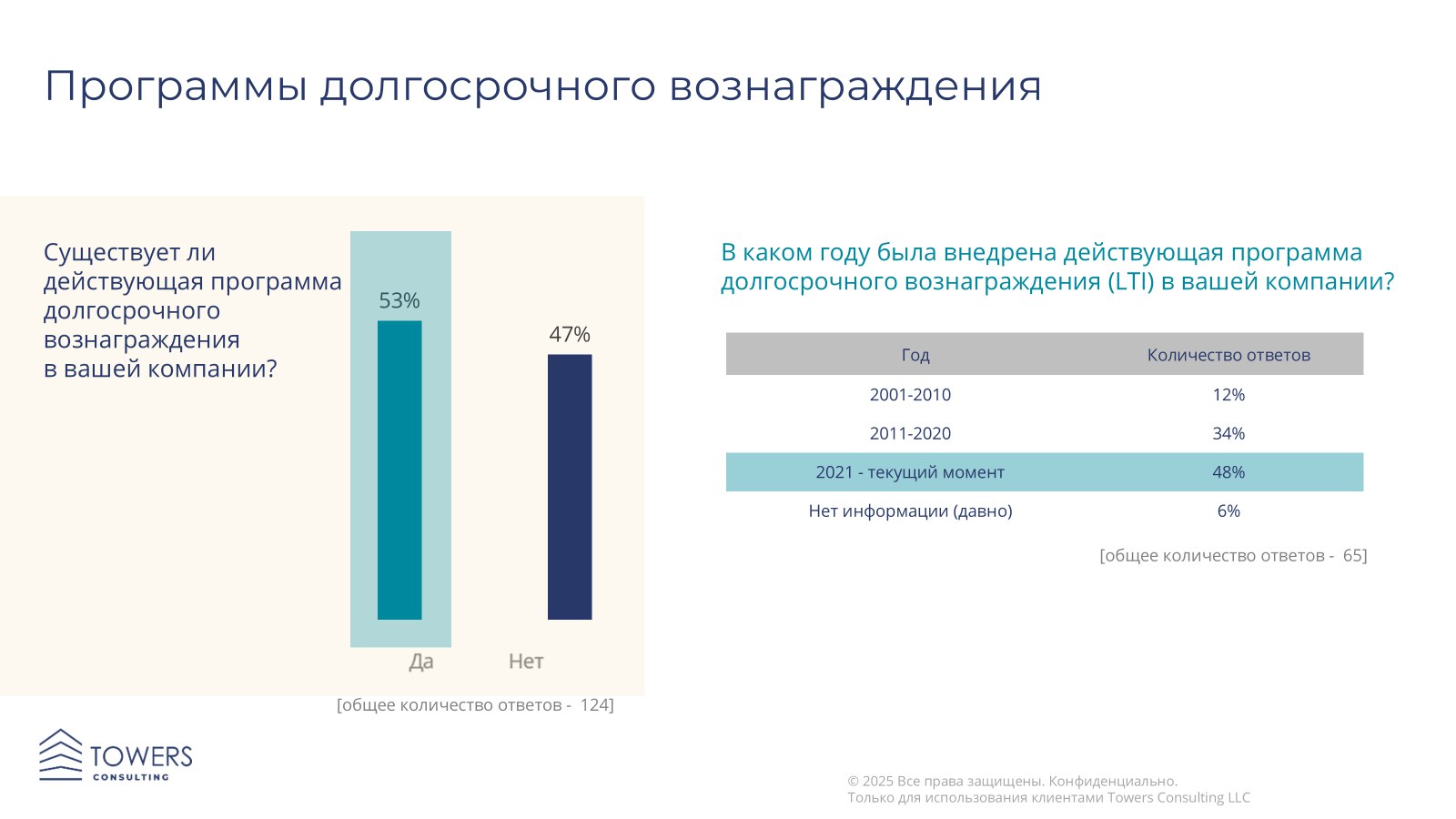 Исследование Towers Consulting в сентябре 2025 г. показало, что интерес бизнеса к программам долгосрочного вознаграждения (LTI) стабильно растет. Чуть больше половины опрошенных компаний в РФ (53%) уже имеют действующие программы долгосрочного вознаграждения, и еще 24% планируют внедрить LTI в ближайшее время.